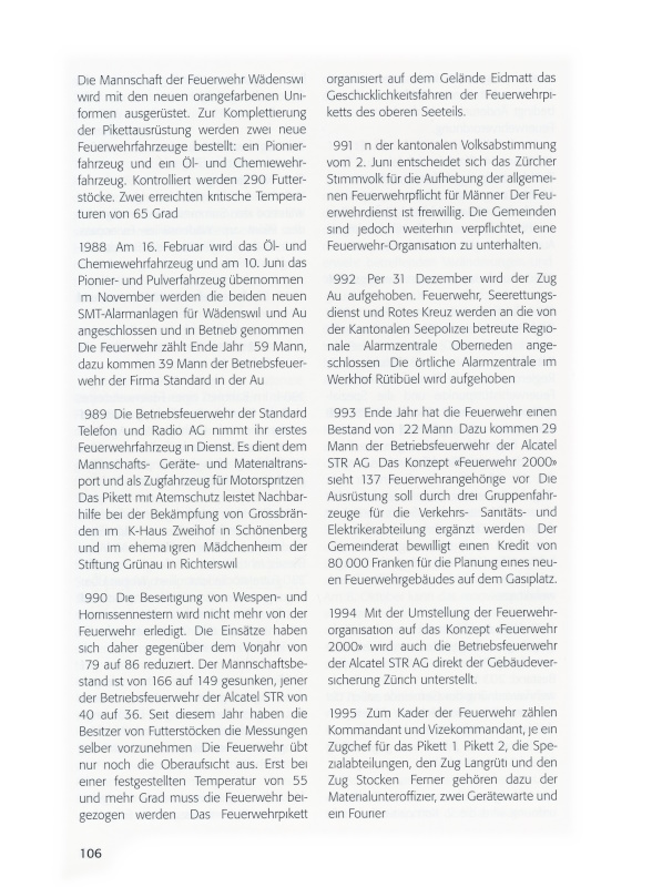 Mit der Umstellung der Feuerwehrorganisation auf das Konzept «Feuerwehr 2000» wird auch die Betriebsfeuerwehr der Alcatel STR AG direkt der Gebäudeversicherung Zürich unterstellt.