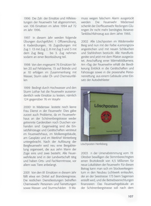 Die Zahl der Einsätze und Hilfeleistungen der Feuerwehr hat abgenommen, von 106 Einsätzen im Jahre 1994 auf 72 im Jahr 1996.