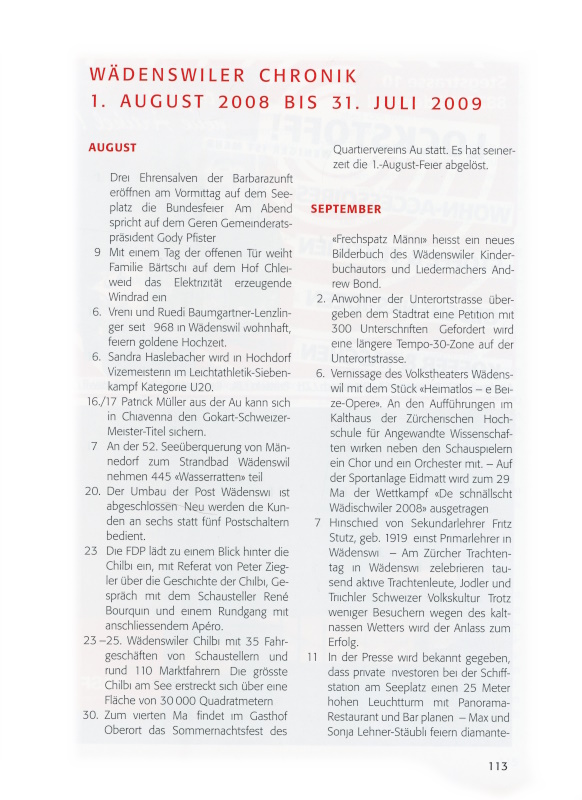 Im Rahmen eines Feuerwehrfestes stellt das Pikett der Bevölkerung am 8. September die neue Drehleiter vor. Am 8./9. September führt die Verkehrs- und Sanitätsabteilung den bereits zur Tradition gewordenen Volksmarsch durch.