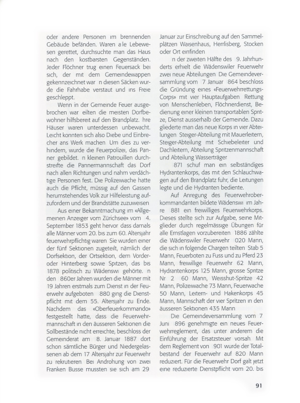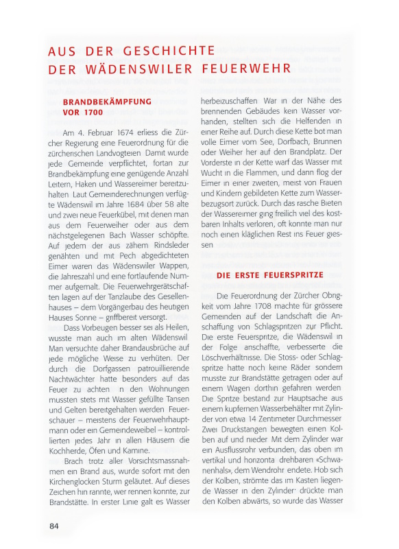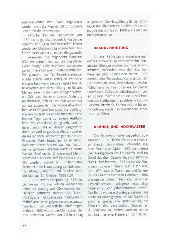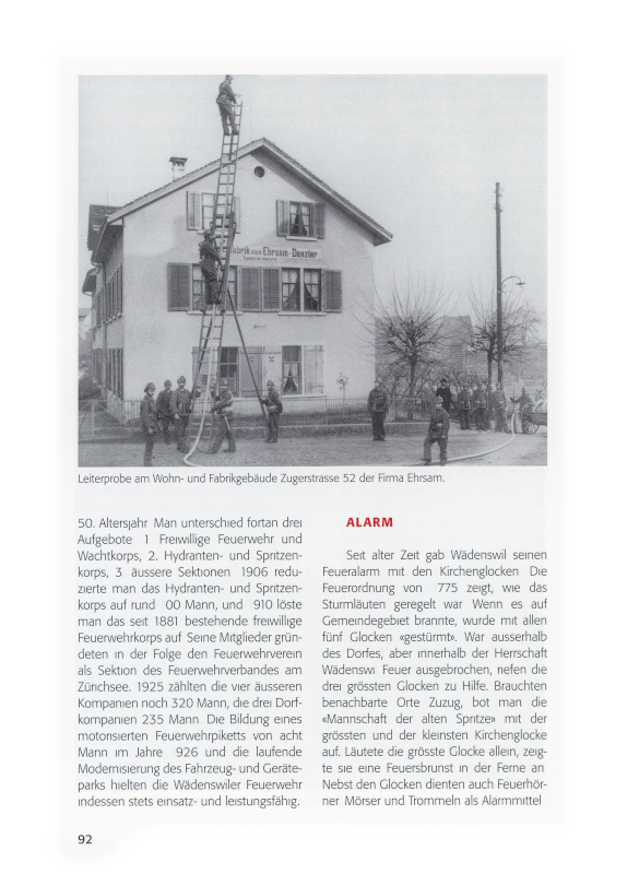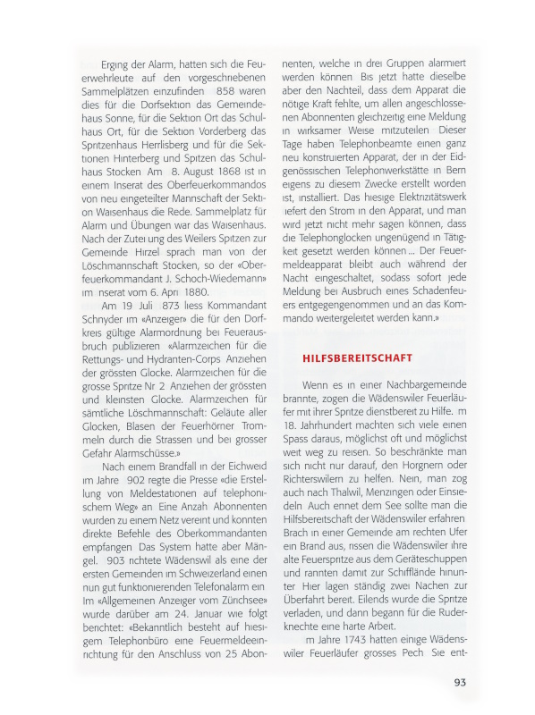 Am 19. Juli 1873 liess Kommandant Schnyder im «Anzeiger» die für den Dorfkreis gültige Alarmordnung bei Feuerausbruch publizieren: «Alarmzeichen für die Rettungs- und Hydranten-Corps: Anziehen der grössten Glocke. Alarmzeichen für die grosse Spritze Nr. 2: Anziehen der grössten und kleinsten Glocke. Alarmzeichen für sämtliche Löschmannschaft: Geläute aller Glocken, Blasen der Feuerhörner, Trommeln durch die Strassen und bei grosser Gefahr Alarmschüsse.»