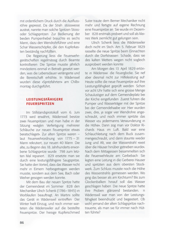 Am Morgen des 13. April 1829 ertönte in Wädenswil die Feuerglocke. Sie rief aber diesmal nicht zur Hilfeleistung auf: Heute sollte die neue Feuerspritze auf ihre Leistungsfähigkeit geprüft werden. Schon vor acht Uhr hatte sich eine grosse Menge Schaulustiger auf dem Gemeindeplatz bei der Kirche eingefunden. Zuerst fuhren die Pumper und Wasserträger mit der Spritze bei der Gemeindehaabe vor. Hier wurden zwei, drei, ja sogar vier Wendrohre angeschraubt, und noch immer spritze das Wasser «zu jedermanns Verwunderung in die Höhe». Dann zog man vor Doktor Richards Haus im Luft. Bald war eine Schlauchleitung nach dem Buck zusammengeschraubt, und dann staunte wieder Jung und Alt, wie der Wasserstrahl «weit über die Häuser hinüber getrieben wurde». Nach dem Mittagessen besammelten sich die Feuerwehrleute am Gerbebach. Sie legten eine Leitung in die Gerberei Hauser und spritzten aus dem obersten Stockwerk. Zum Schluss musste noch die Höhe des Wasserstrahls gemessen werden. Wo ging das besser als am Kirchturm? Bis zum Glockenbalken hinauf soll das Wasser geschlagen haben. Die neue Spritze hatte ihre Proben glänzend bestanden. In Wädenswil war man von der Leistungsfähigkeit beeindruckt und begeistert. Ob wohl jemand der alten Schlagspritze nachtrauerte, als man sie für immer nach Hütten führte?