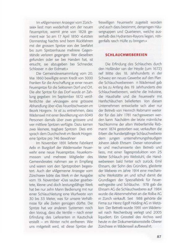 Die Erfindung des Schlauches durch den Holländer van der Heyde (um 1672) rief Mitte des 18. Jahrhunderts in der Schweiz ein neues Gewerbe auf den Plan: die Schlauchwebereien. In Wädenswil gab es bis zu Anfang des 19. Jahrhunderts drei Schlauchwebereien, welche die Industrie, die Haushalte und die Feuerwehr mit Hanfschläuchen belieferten. Von diesen Unternehmen entwickelte sich aber nur der Betrieb von Heinrich Rebmann weiter, der für das Jahr 1781 nachgewiesen werden kann. Nachdem der letzte männliche Nachkomme der alten Weberfamilie Rebmann 1874 gestorben war, verkauften die Erben die hundertjährige Schlauchweberei dem jungen unternehmungsfreudigen Johann Jakob Ehrsam. Dieser rationalisierte und mechanisierte den Betrieb und liess, mit einer Tagesproduktion von 25 Meter Schlauch pro Webstuhl, die Handwebereien bald hinter sich zurück. Emil Ehrsam, der Sohn des Gründers, gliederte der Weberei im Jahre 1914 eine mechanische Werkstätte an und schuf damit die Grundlagen der Spezialfabrik für Feuerwehrgeräte und Schläuche. 1978 gab die Ehrsam AG die Schlauchweberei auf. 1984 wurde die Aktienmehrheit an die Rolba AG in Zürich verkauft. Seit 1988 gehörte die Firma zur Heinz Egolf Holding AG in Wetzikon. Der Betrieb wurde 1991 von Wädenswil nach Reichenburg verlegt und 2005 liquidiert. Ein Grossteil des Archivs wird heute in der Dokumentationsstelle Oberer Zürichsee in Wädenswil aufbewahrt.