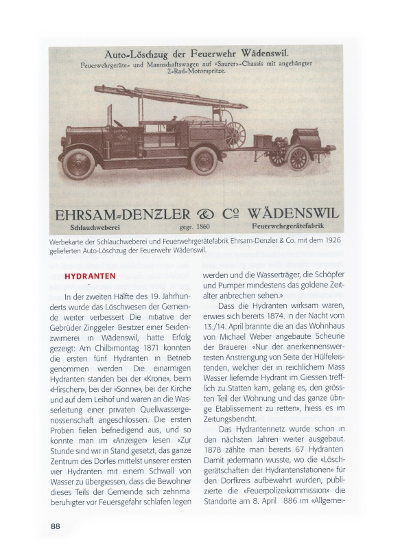 88 Werbekarte der Schlauchweberei und Feuerwehrgerätefabrikant Ehrsam-Denzler & Co. mit dem 1926 gelieferten Auto-Löschzug der Feuerwehr Wädenswil.
