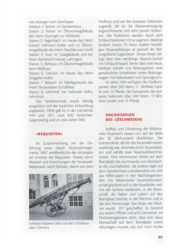 In der zweiten Hälfte des 19. Jahrhunderts wurde das Löschwesen der Gemeinde weiter verbessert Die Initiative der Gebrüder Zinggeler, Besitzer einer Seidenzwirnerei in Wädenswil, hatte Erfolg gezeigt: Am Chilbimontag 1871 konnten die ersten fünf Hydranten in Betrieb genommen werden. Die einarmigen Hydranten standen bei der «Krone», beim «Hirschen», bei der «Sonne», bei der Kirche und auf dem Leihof und waren an die Wasserleitung einer privaten Quellwassergenossenschaft angeschlossen. Die ersten Proben fielen befriedigend aus, und so konnte man im «Anzeiger» lesen: «Zur Stunde sind wir in Stand gesetzt, das ganze Zentrum des Dorfes mittelst unserer ersten vier Hydranten mit einem Schwall von Wasser zu übergiessen, dass die Bewohner dieses Teils der Gemeinde sich zehnmal beruhigter vor Feuersgefahr schlafen legen werden und die Wasserträger, die Schöpfer und Pumper mindestens das goldene Zeitalter anbrechen sehen.»