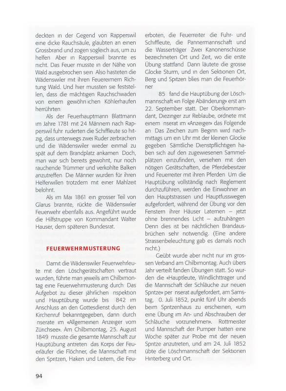 Als im Mai 1861 ein grosser Teil von Glarus brannte, rückte die Wädenswiler Feuerwehr ebenfalls aus. Angeführt wurde die Hilfstruppe von Kommandant Walter Hauser, dem späteren Bundesrat.