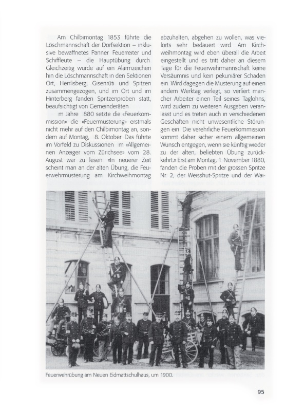 Am Chilbimontag 1853 führte die Löschmannschaft der Dorfsektion – inklusive bewaffnetes Panner, Feuerreiter und Schiffleute – die Hauptübung durch. Gleichzeitig wurde auf ein Alarmzeichen hin die Löschmannschaft in den Sektionen Ort, Herrlisberg, Gisenrüti und Spitzen zusammengezogen, und im Ort und im Hinterberg fanden Spritzenproben statt, beaufsichtigt von Gemeinderäten.