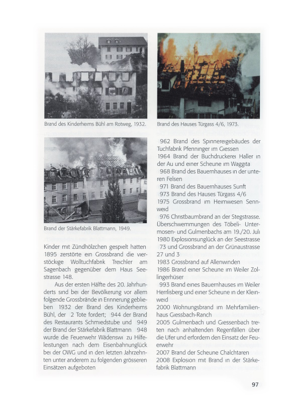 Die Feuerwehr hatte wiederholt auszurücken. 1846 fielen die Huber-Häuser, am Standort des späteren Waisenhauses, dem Feuer zum Opfer. 1865 alarmierten die Sturmglocken die Feuerwehr, weil im Gwad das alte hölzerne Haus von Blattmacher Huber brannte. 1873 rückte die Feuerwehr zu einem Brand auf Felsen aus, und 1874 standen Wohnhaus und Scheune der Brauerei Weber in Flammen. 1880 brannte die mitten im Reidholz, hart an der Einsiedlerstrasse gelegene ehemalige Hubersche Schnupftabakstampfe nieder. Der Brand wurde erst wahrgenommen, als Leute zur Arbeit gingen und der Dachstuhl schon eingestürzt war. 1887 galt es, die Scheune des Viehhändlers Stocker im «Grundstein» zu löschen, und im selben Jahr brannten zwei Häuser am Zentral, weil Kinder mit Zündhölzchen gespielt hatten. 1895 zerstörte ein Grossbrand die vierstöckige Wolltuchfabrik Treichler am Sagenbach gegenüber dem Haus Seestrasse 148.