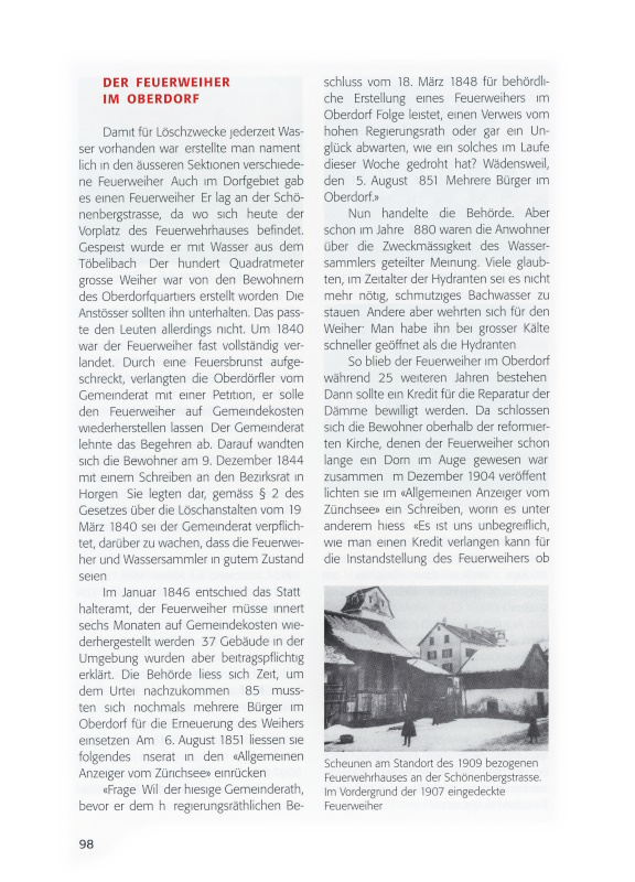 98 Scheunen am Standort des 1909 bezogenen Feuerwehrhauses an der Schönenbergstrasse. Im Vordergrund der 1907 eingedeckte Feuerweiher.