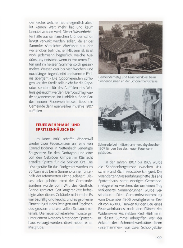 Dieser Wasserbehälter hätte aus sanitarischen Gründen schon längst verwirkt werden sollen, da er der Sammler sämtlicher Abwässer aus den weiter oben befindlichen Häusern ist. Es ist wohl jedermann begreiflich, welche Ausdünstung entsteht, wenn in trockenen Zeiten und im heissen Sommer solch gesammeltes Wasser drei bis vier Wochen und noch länger liegen bleibt und somit in Fäulnis übergeht.» Die Opponierenden schlugen vor, der Kredit solle nicht für die Reparatur, sondern für das Auffüllen des Weihers gebraucht werden. Der Vorschlag wurde angenommen. Im Hinblick auf den Bau des neuen Feuerwehrhauses liess die Gemeinde den Feuerweiher im Jahre 1907 auffüllen.