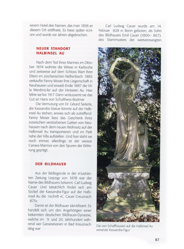 Weshalb Heinrich Moser seiner Frau Fanny ausgerechnet eine Kassandra-Statue geschenkt hat, ist nicht bekannt und bleibt das Geheimnis dieses Ehepaars. Doch, wer war Kassandra? Gemäss der griechischen Mythologie war sie die Tochter des trojanischen Königs Priamos. Laut Homer soll sie so bezaubernd gewesen sein wie Aphrodite. Der Gott Apollon verliebte sich in die Schöne und verlieh ihr die Gabe der Vorhersehung. Doch Kassandra verschmähte den Liebhaber. Dies erzürnte den olympischen Gott derart, dass er sie mit einem Fluch strafte: Niemand sollte ihren Prophezeiungen glauben. Vergeblich warnte Kassandra daher die Trojaner vor dem Trojanischen Pferd, der Hinterlist der Griechen, so dass Troja unterging.