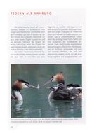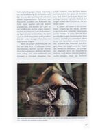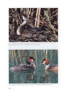 46 Ein Haubentaucher hütet die Jungen unter den Flügeln, während sie der andere füttert. Nebst Fischchen verabreicht er auch Federn, die er aus seinem Gefieder zupft.