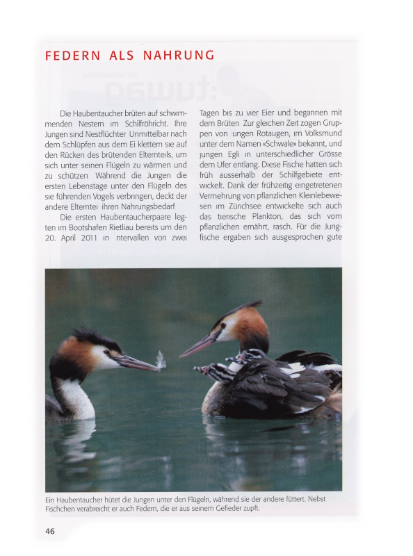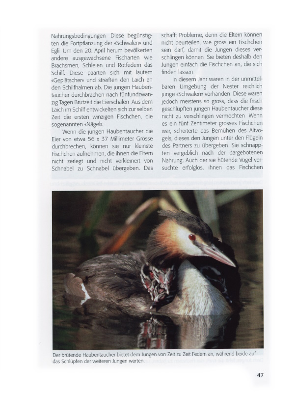 Paare die später mit Brüten begannen, hatten grosse Probleme, ihrer Aufgabe gerecht zu werden. Sie hatten Mühe, kleinste «Schwalen» und Egli zu finden. Ein Ersatz wären die im Schilf aufwachsenden Fischchen gewesen. Diese kamen jedoch zur Welt, als das Seewasser für wenige Wochen ungewohnt klar war und ihnen zur Entwicklung das nötige Plankton fehlte. Der Haubentaucher, welcher die Jungen führte, blieb fast regungslos immer an demselben Platz im Schilf. Die Jungen rührten sich kaum. Mit den Federn als Nahrung überlebte schliesslich nur der Stärkste die ersten kritischen Tage. Es war derjenige, der sich vordrängte und immer zuerst nach der dargebotenen Nahrung schnappte.
