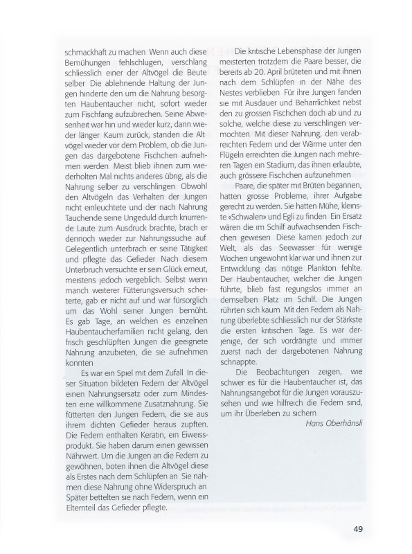 Die kritische Lebensphase der Jungen meisterten trotzdem die Paare besser, die bereits ab 20. April brüteten und mit ihnen nach dem Schlüpfen in der Nähe des Nestes verblieben. Für ihre Jungen fanden sie mit Ausdauer und Beharrlichkeit nebst den zu grossen Fischchen doch ab und zu solche, welche diese zu verschlingen vermochten. Mit dieser Nahrung, den verabreichten Federn und der Wärme unter den Flügeln erreichten die Jungen nach mehreren Tagen ein Stadium, das ihnen erlaubte, auch grössere Fischchen aufzunehmen.