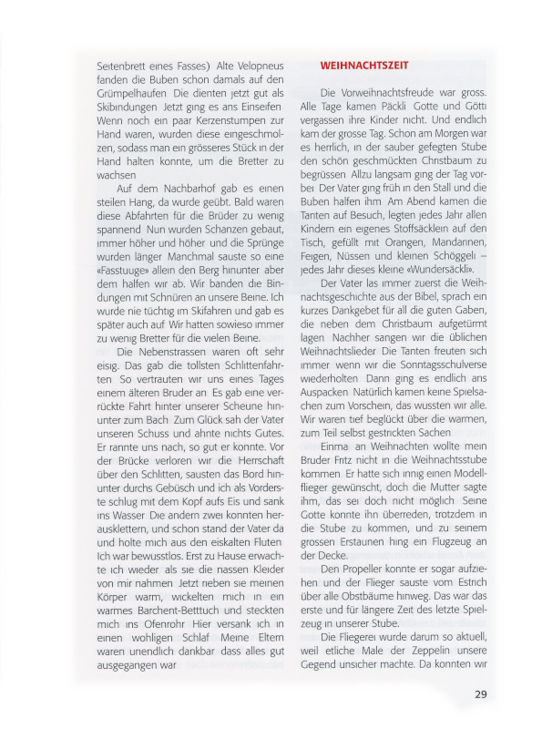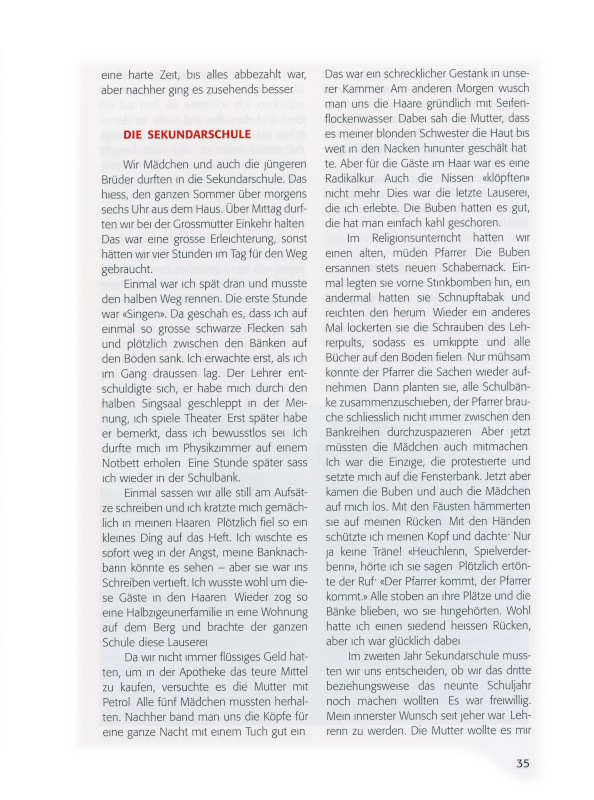 Einmal, als die Mutter und ich allein in der Küche arbeiteten, kam sie mir so still vor. Dann erzählte sie mir, dass sie grossen Kummer hätten, sie brächten den Zins auch nicht mehr zusammen. Letztes Jahr, als der Vater verspätet zinsen wollte, sagte der Bankverwalter, es sei schon in Ordnung gebracht worden, er dürfe ihm die Quittung überreichen. Nie erfuhren wir, wer das für uns bezahlt hatte. Wir vermuteten, der Verwalter selbst.