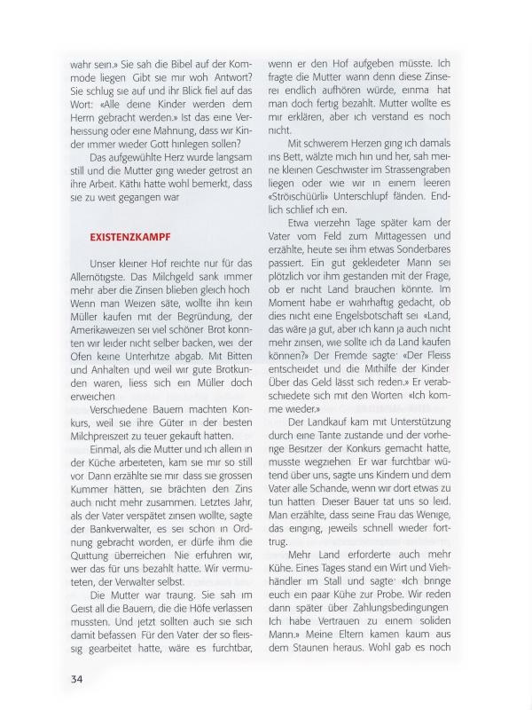 Die Mutter war traurig. Sie sah im Geist all die Bauern, die die Höfe verlassen mussten. Und jetzt sollten auch sie sich damit befassen. Für den Vater, der so fleissig gearbeitet hatte, wäre es furchtbar, wenn er den Hof aufgeben müsste. Ich fragte die Mutter, wann denn diese Zinserei endlich aufhören würde, einmal hat man doch fertig bezahlt. Mutter wollte es mir erklären, aber ich verstand es noch nicht.