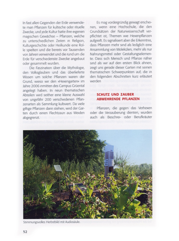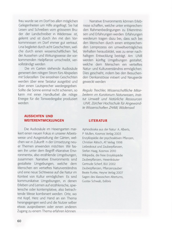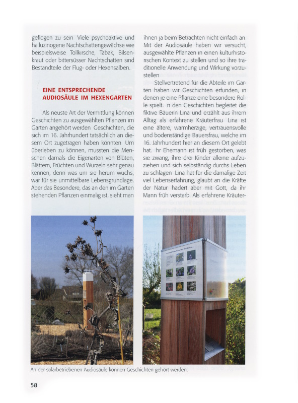 Die Audiosäule im Hexengarten markiert einen neuen Fokus in unserer Arbeitsweise und Ausgestaltung der Gärten, welchen wir in Zukunft in der Umsetzung neuer Themen anwenden möchten. Wir fassen ihn unter dem Begriff «Narrative Environments», also erzählende Umgebungen, zusammen. Narrative Environments sind gestaltete Umgebungen, welche dem Menschen ein vertieftes Naturverständnis und eine neue Sichtweise auf die Natur im Kontext von Kultur ermöglichen. Es sind kommunikative Umgebungen, in denen Erleben und Lernen auf erzählerische, spielerische oder kontemplative, also betrachtende Weise kombiniert werden. Orte, wo mit Kopf, Herz und Hand an ein Thema herangegangen wird und die Nutzer selber etwas ausprobieren oder einen anderen Zugang zu einem Thema erfahren können.