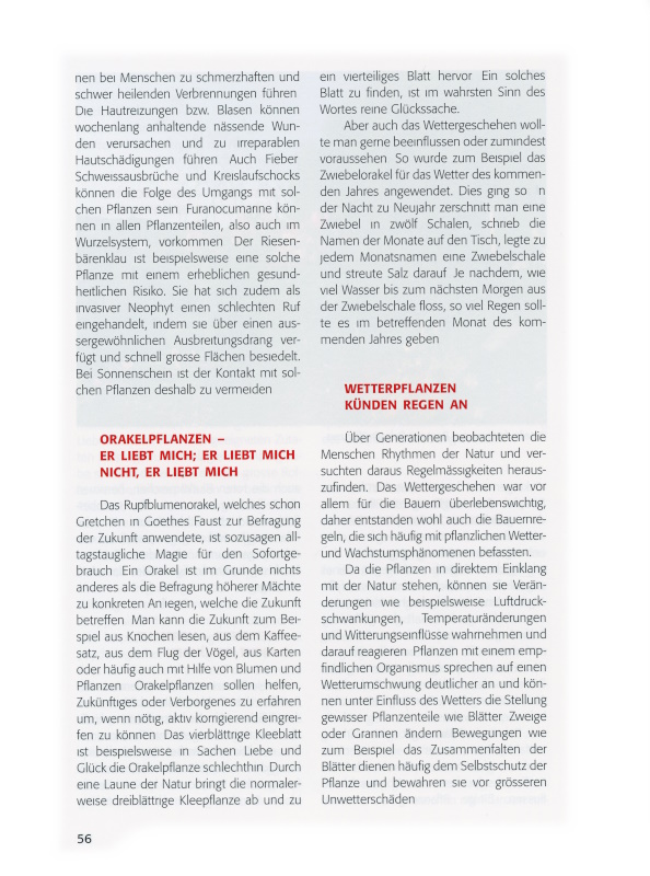 Das Rupfblumenorakel, welches schon Gretchen in Goethes Faust zur Befragung der Zukunft anwendete, ist sozusagen alltagstaugliche Magie für den Sofortgebrauch. Ein Orakel ist im Grunde nichts anderes als die Befragung höherer Mächte zu konkreten Anliegen, welche die Zukunft betreffen. Man kann die Zukunft zum Beispiel aus Knochen lesen, aus dem Kaffeesatz, aus dem Flug der Vögel, aus Karten oder häufig auch mit Hilfe von Blumen und Pflanzen. Orakelpflanzen sollen helfen, Zukünftiges oder Verborgenes zu erfahren um, wenn nötig, aktiv korrigierend eingreifen zu können. Das vierblättrige Kleeblatt ist beispielsweise in Sachen Liebe und Glück die Orakelpflanze schlechthin. Durch eine Laune der Natur bringt die normalerweise dreiblättrige Kleepflanze ab und zu ein vierteiliges Blatt hervor. Ein solches Blatt zu finden, ist im wahrsten Sinn des Wortes reine Glückssache.