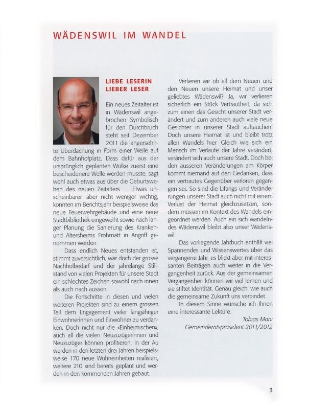 Ein neues Zeitalter ist in Wädenswil angebrochen. Symbolisch für den Durchbruch steht seit Dezember 2011 die langersehnte Überdachung in Form einer Welle auf dem Bahnhofplatz. Das dafür aus der ursprünglich geplanten Wolke zuerst eine bescheidene Welle werden musste, sagt wohl auch etwas aus über die Geburtswehen des neuen Zeitalters … Etwas unscheinbarer, aber nicht weniger wichtig, konnten im Berichtsjahr beispielsweise das neue Feuerwehrgebäude und eine neue Stadtbibliothek eingeweiht sowie nach langer Planung die Sanierung des
