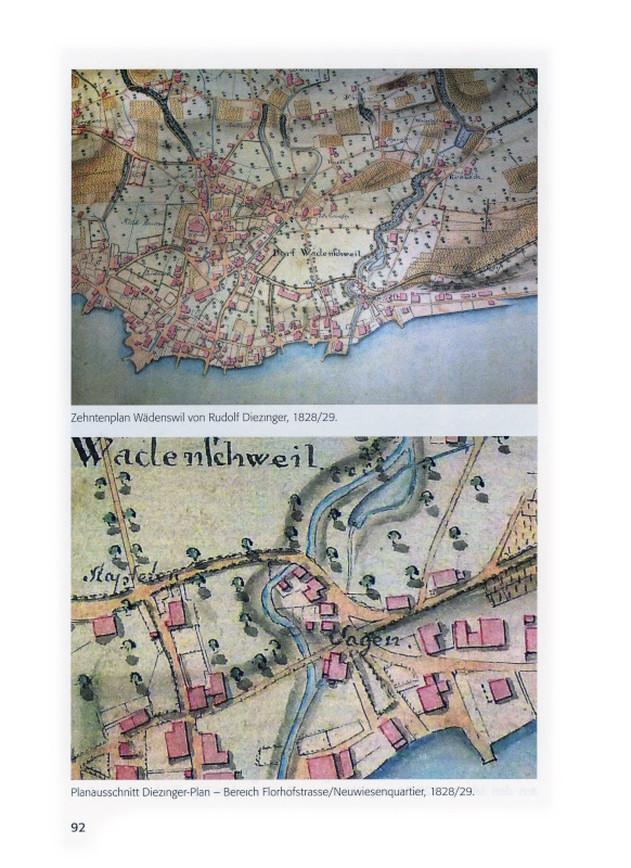 Der prächtige, handkolorierte Zehntenplan von Geometer Rudolf Diezinger aus den Jahren 1828/29 zeigt Wädenswil noch als Dorf. Die Landwirtschaft bildet das Haupteinkommen der meisten damaligen Einwohner. Auf dem Plan sind bereits Gebäude und Strassenführungen erkennbar, die heute noch Bestand haben. So entspricht unter anderem die heutige Florhofstrasse von der Zugerstrasse bis zur Einmündung in die Seestrasse praktisch unverändert der damaligen Alten Landstrasse, die dann weiter über den Galgenrain (heute Bürglistrasse) Richtung Zürich führte. Auch der jetzt noch bestehende markante Rank kurz vor der Einmündung in die Seestrasse, ist auf dem Diezinger-Plan deutlich erkennbar. Weiter schlängelte sich damals der Sagenbach (Kräbach) noch offen durch die Wiese, unterquerte die Alte Landstrasse bevor er dann an der Sägerei vorbei in den See mündete. Zwischen dem Sagenbach und dem Fuss des Galgenhügels lag der Stegweiher, das Wasserreservoir für die sich weiter unten befindende Sägerei.