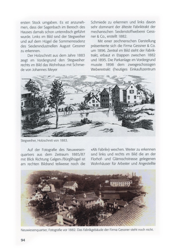 Auf der Fotografie des Neuwiesenquartiers aus dem Zeitraum 1885/87 mit Blick Richtung Galgen-/Bürglihügel ist am rechten Bildrand teilweise noch die Schmiede zu erkennen und links davon sehr dominant der älteste Fabriktrakt der mechanischen Seidenstoffweberei Gessner & Co., erstellt 1882.