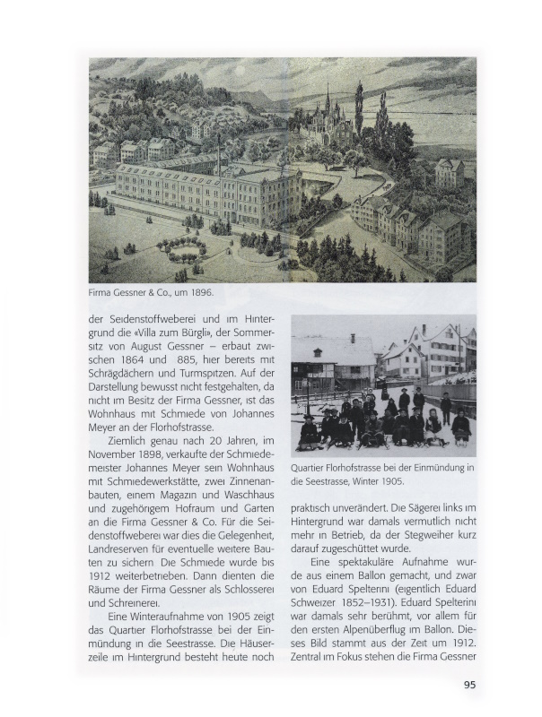 Mit dieser zeichnerischen Darstellung präsentierte sich die Firma Gessner & Co. um 1896. Zentral im Bild steht der Fabriktrakt, erbaut in Etappen zwischen 1882 und 1895. Die Parkanlage im Vordergrund musste 1898 dem zweigeschossigen Webereitrakt (heutiges Einkaufszentrum «Alti Fabrik») weichen. Weiter zu erkennen sind links und rechts im Bild die an der Florhof- und Glärnischstrasse gelegenen Wohnhäuser für Arbeiter und Angestellte der Seidenstoffweberei und im Hintergrund die «Villa zum Bürgli», der Sommersitz von August Gessner – erbaut zwischen 1864 und 1885, hier bereits mit Schrägdächern und Turmspitzen. Auf der Darstellung bewusst nicht festgehalten, da nicht im Besitz der Firma Gessner, ist das Wohnhaus mit Schmiede von Johannes Meyer an der Florhofstrasse.