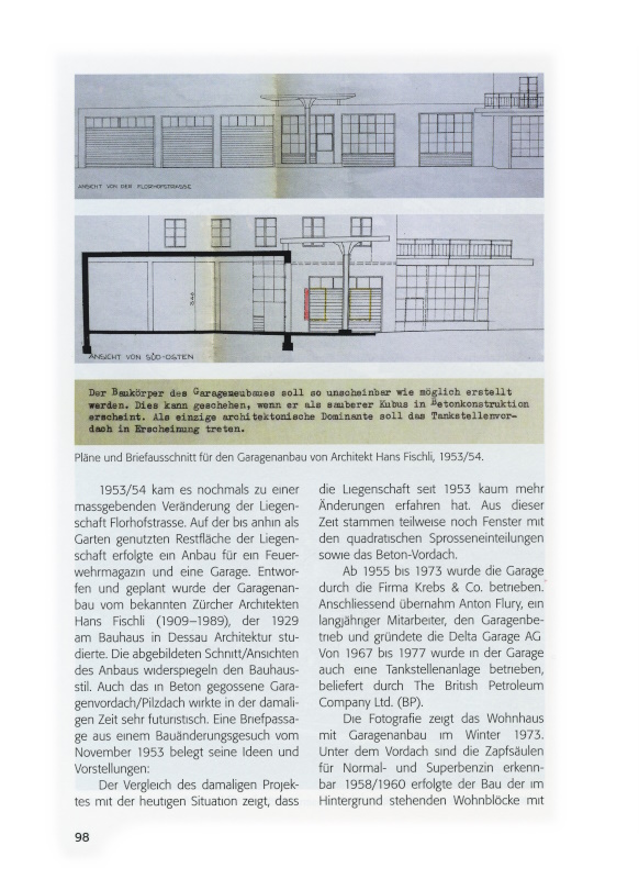 1953/54 kam es nochmals zu einer massgebenden Veränderung der Liegenschaft Florhofstrasse. Auf der bis anhin als Garten genutzten Restfläche der Liegenschaft erfolgte ein Anbau für ein Feuerwehrmagazin und einer Garage. Entworfen und geplant wurde der Garagenanbau vom bekannten Zürcher Architekten Hans Fischli (1909–1989), der 1929 am Bauhaus in Dessau Architektur studierte. Die abgebildeten Schnitt/Ansichten des Anbaus wiederspiegeln den Bauhausstil. Auch das in Beton gegossene Garagenvordach/Pilzdach wirkte in der damaligen Zeit sehr futuristisch. Eine Briefpassage aus einem Bauänderungsgesuches vom November 1953 belegt seine Ideen und Vorstellungen: