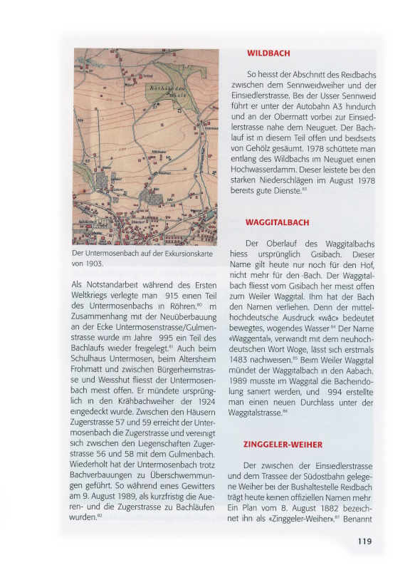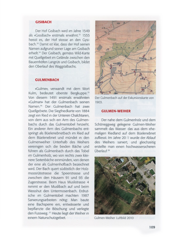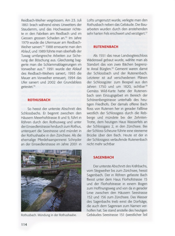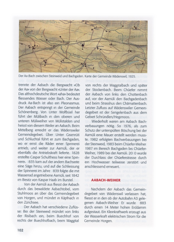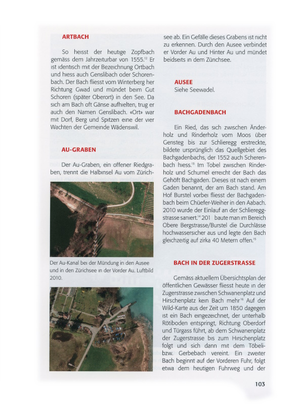 Nachstehend werden in alphabetischer Abfolge die Wädenswiler Bäche beschrieben. Dabei geht es speziell um das Quellgebiet und den Verlauf des Gewässers, aber auch um dessen Namen, die Funktion und um Besonderheiten. Als Quelle für Erstbelege und Namendeutungen dient dabei die von Daniel Hess verfasste, ungedruckte Lizentiatsarbeit «Eine alte Namenlandschaft. Am Beispiel der Pfarrei Wädenswil».[ix] Karl Bachmann und Titus Zoller danke ich für die Durchsicht des Textes und für viele Anregungen und Hinweise.