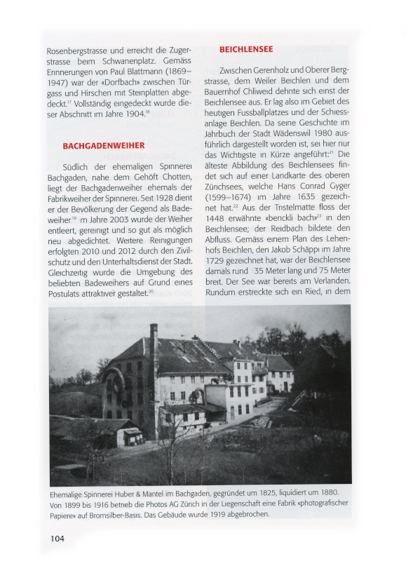 104 Ehemalige Spinnerei Huber & Mantel im Bachgaden, gegründet um 1825, liquidiert um 1880. Von 1899 bis 1916 betrieb die Photos AG Zürich in der Liegenschaft eine Fabrik "photographischer Papiere" auf Bromsilber-Basis. Das Gebäude wurde 1919 abgebrochen.