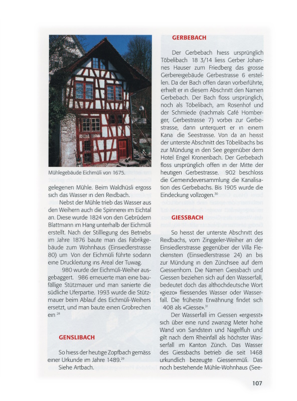 So heisst der unterste Abschnitt des Reidbachs, vom Zinggeler-Weiher an der Einsiedlerstrasse gegenüber der Villa Fleckenstein (Einsiedlerstrasse 24) an bis zur Mündung in den Zürichsee auf dem Giessenhorn. Die Namen Giessbach und Giessen beziehen sich auf den Wasserfall, bedeutet doch das althochdeutsche Wort «giezo» fliessendes Wasser oder Wasserfall. Die früheste Erwähnung findet sich 1408 als «Giesse»[xxxi].