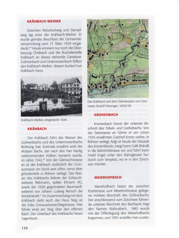 Der Krähbach führt das Wasser des Gulmenbachs und des Untermosenbachs Richtung See. Erstmals erwähnt wird der «Kräyen Bach», der nach den hier häufig vorkommenden Krähen benannt wurde, im Jahre 1542.[xl] Von der Glärnischstrasse an ist der Krähbach südöstlich der Grünaustrasse ein Stück weit offen, sonst aber grösstenteils in Röhren verlegt. Das Wasser des Krähbachs lieferte der Schlauchweberei Rebmann, später Ehrsam AG, sowie der 1830 gegründeten Baumwollweberei von Johann Ludwig Rensch die Antriebskraft.[xli] Im Zusammenhang mit dem Krähbach steht auch das Haus Steg an der Ecke Grünaustrasse/Stegstrasse. Hier führte einst ein Steg über den offenen Bach. Der Unterlauf des Krähbachs heisst Sagenbach.