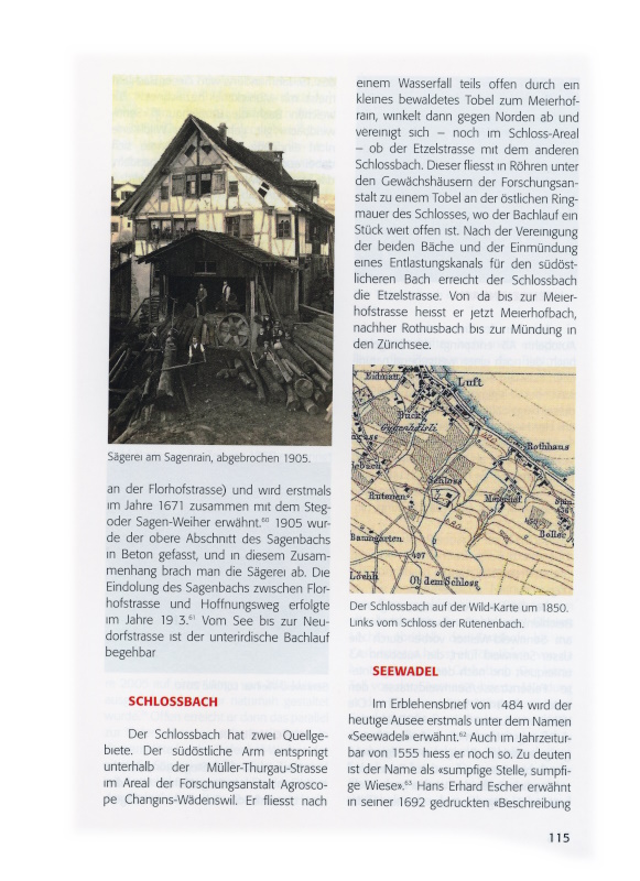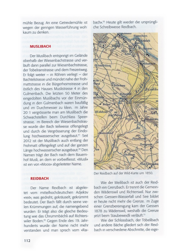 Gute Aufschlüsse über den Verlauf der Wädenswiler Gewässer geben sodann die Dufourkarte ab 1854 und die Siegfriedkarte ab 1884.[iii] Noch weitgehend offene Bachverläufe sind auf der Karte der Gemeinde Wädenswil und Umgebung zu erkennen, welche der Verschönerungsverein im Jahre 1903 herausgegeben hat.[iv]