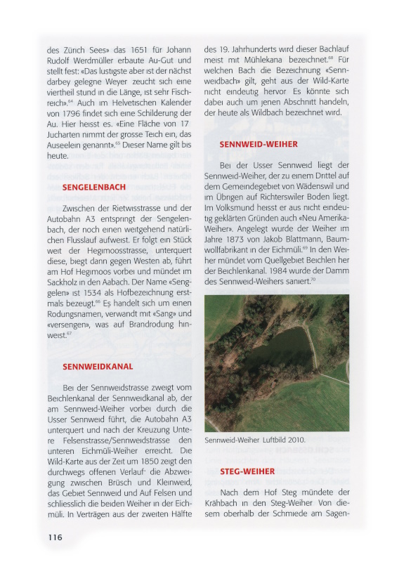 Zwischen der Rietwisstrasse und der Autobahn A3 entspringt der Sengelenbach, der noch einen weitgehend natürlichen Flusslauf aufweist. Er folgt ein Stück weit der Hegimoosstrasse, unterquert diese, biegt dann gegen Westen ab, führt am Hof Hegimoos vorbei und mündet im Sackholz in den Aabach. Der Name «Senggelen» ist 1534 als Hofbezeichnung erstmals bezeugt.[xxv] Es handelt sich um einen Rodungsnamen, verwandt mit «Sang» und «versengen», was auf Brandrodung hinweist.[xxvi]