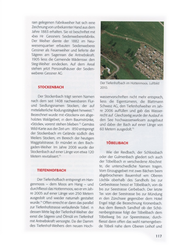 Der Tiefenhofbach entspringt im Hangenmoos – dem Moos am Hang – und durchfliesst das Hottenmoos, wo er im Jahre 2005 auf einer Länge von 250 Metern ausgedolt und wieder naturnah gestaltet wurde.[xxxiii] Offen erreicht er dann das parallel zur Tiefenhofstrasse verlaufende Tobel. In dessen Mitte lag der Tiefenhof-Weiher, der einst die Sägerei und Ölmüli im Tiefenhof mit Antriebskraft versorgte. Da der Damm des Tiefenhof-Weihers den neuen Hochwasservorschriften nicht mehr entsprach, liess die Eigentümerin, die Blattmann Schweiz AG, den Tiefenhofweiher im Jahre 2006 auffüllen und gab das Wasserrecht auf. Gleichzeitig wurde der Auslauf in den See hochwasserwirksam ausgebaut und dabei der Bach auf einer Länge von 60 Metern ausgedolt.[xxxiv]