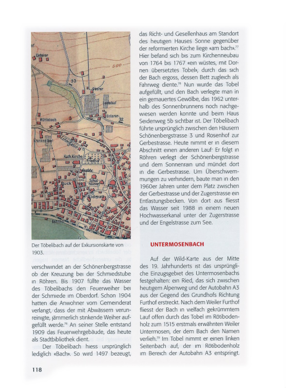 Gemäss aktuellem Übersichtsplan der öffentlichen Gewässer fliesst heute in der Zugerstrasse zwischen Schwanenplatz und Hirschenplatz kein Bach mehr.[xviii] Auf der Wild-Karte aus der Zeit um 1850 dagegen ist ein Bach eingezeichnet, der unterhalb Rötiboden entspringt, Richtung Oberdorf und Türgass führt, ab dem Schwanenplatz der Zugerstrasse bis zum Hirschenplatz folgt und sich dann mit dem Töbeli- bzw. Gerbebach vereint. Ein zweiter Bach beginnt auf der Vorderen Fuhr, folgt etwa dem heutigen Fuhrweg und der Rosenbergstrasse und erreicht die Zugerstrasse beim Schwanenplatz. Gemäss Erinnerungen von Paul Blattmann (1869–1947) war der «Dorfbach» zwischen Türgass und Hirschen mit Steinplatten abgedeckt.[xix] Vollständig eingedeckt wurde dieser Abschnitt im Jahre 1904.[xx]