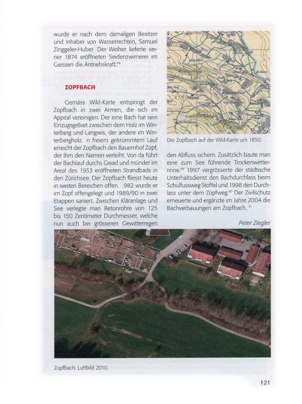 So heisst der heutige Zopfbach gemäss dem Jahrzeiturbar von 1555.[xii] Er ist identisch mit der Bezeichnung Ortbach und hiess auch Genslibach oder Schorenbach. Der Bach fliesst vom Winterberg her Richtung Gwad und mündet beim Gut Schoren (später Oberort) in den See. Da sich am Bach oft Gänse aufhielten, trug er auch den Namen Genslibach. «Ort» war mit Dorf, Berg und Spitzen eine der vier Wachten der Gemeinde Wädenswil.