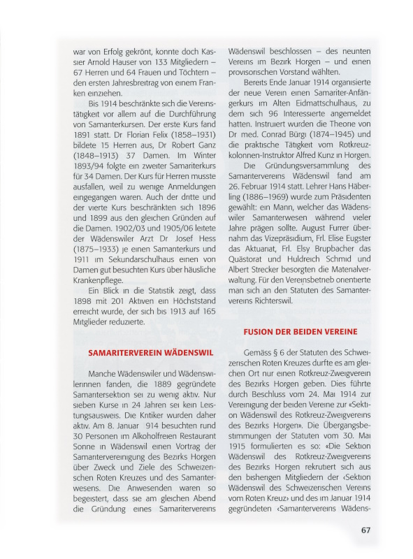 «Die Sektion Wädenswil des Rotkreuz-Zweigvereins des Bezirks Horgen rekrutiert sich aus den bisherigen Mitgliedern der „Sektion Wädenswil des Schweizerischen Vereins vom Roten Kreuz“ und des im Januar 1914 gegründeten „Samaritervereins Wädenswil“. Vermögen und Material der beiden Vereine bilden vereinigt die Aktiven der neuen „Sektion Wädenswil des Rotkreuz-Zweigvereins des Bezirkes Horgen“».