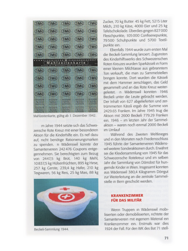 Im Jahre 1944 setzte sich das Schweizerische Rote Kreuz mit einer besonderen Aktion für die Kinderhilfe ein. Es rief dazu auf, nicht benötige Rationierungsmarken zu spenden. In Wädenswil konnte der Samariterverein 242'476 Coupons entgegennehmen. Sie berechtigten zum Bezug von 2'447,5 kg Brot, 140 kg Mehl, 10'837,5 kg Hülsenfrüchten, 895 kg Hirse, 257 kg Gerste, 239,4 kg Hafer, 210 kg Teigwaren, 56 kg Reis, 25 kg Mais, 88 kg Zucker, 70 kg Butter, 45 kg Fett, 5'215 Liter Milch, 210 kg Käse, 4'000 Eier und 25 kg Tafelschokolade. Überdies gingen 827'000 Fleischpunkte, 105'000 Confiseriepunkte, 79'500 Schuhpunkte und 5'700 Textilpunkte ein.