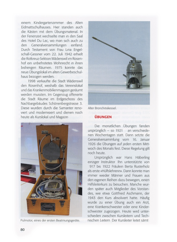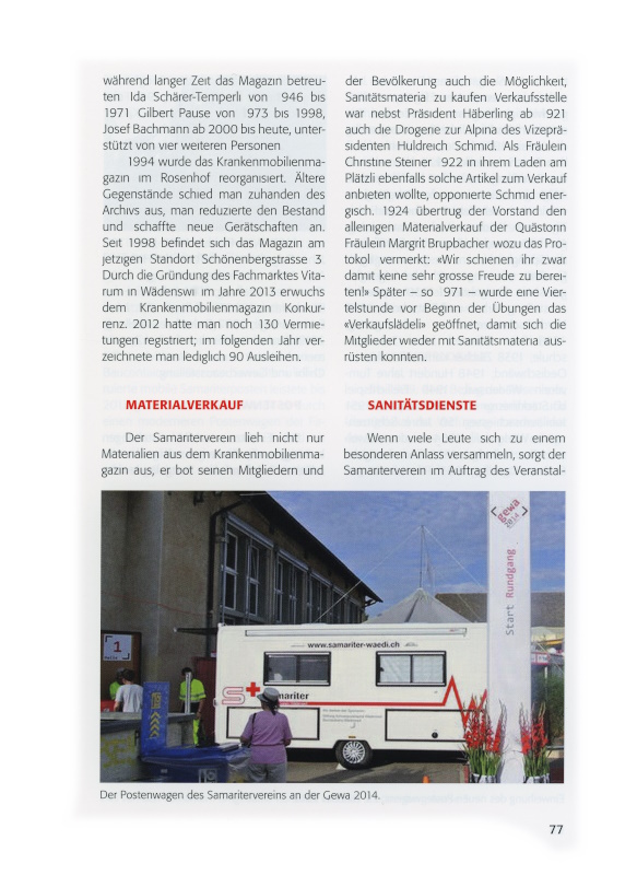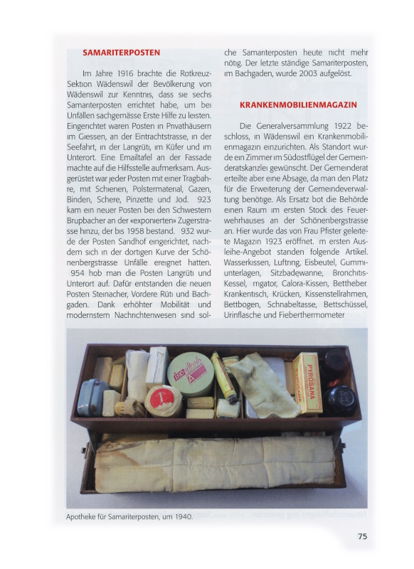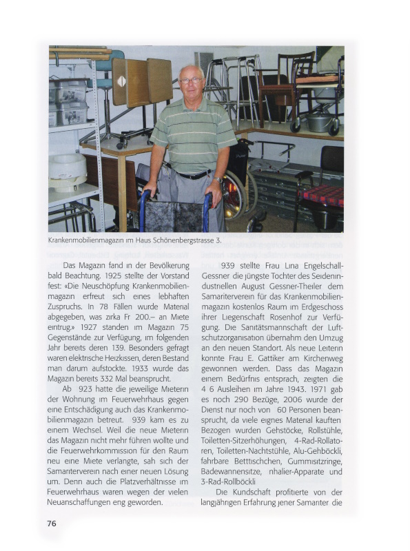 Rosenhof zur Verfügung. Die Sanitätsmannschaft der Luftschutzorganisation übernahm den Umzug an den neuen Standort. Als neue Leiterin konnte Frau E. Gattiker am Kirchenweg gewonnen werden. Dass das Magazin einem Bedürfnis entsprach, zeigten die 416 Ausleihen im Jahre 1943. 1971 gab es noch 290 Bezüge, 2006 wurde der Dienst nur noch von 160 Personen beansprucht, da viele eignes Material kauften. Bezogen wurden Gehstöcke, Rollstühle, Toiletten-Sitzerhöhungen, 4-Rad-Rollatoren, Toiletten-Nachtstühle, Alu-Gehböckli, fahrbare Betttischchen, Gummisitzringe, Badewannensitze, Inhalier Apparate und 3-Rad-Rollböckli.