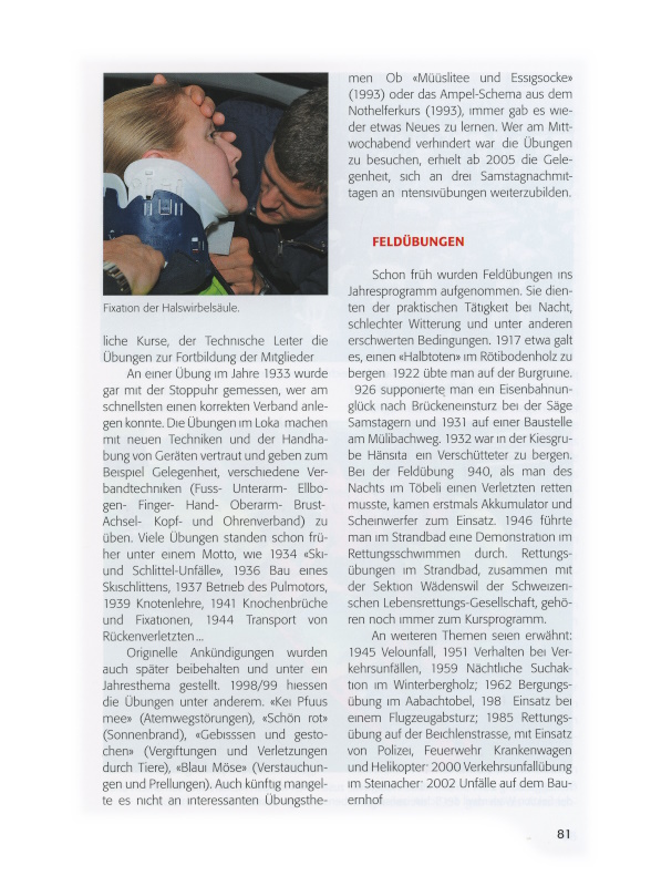 Originelle Ankündigungen wurden auch später beibehalten und unter ein Jahresthema gestellt. 1998/99 hiessen die Übungen unter anderem: «Kei Pfuus mee» (Atemwegstörungen), «Schön rot» (Sonnenbrand), «Gebisssen und gestochen» (Vergiftungen und Verletzungen durch Tiere), «Blaui Möse» (Verstauchungen und Prellungen). Auch künftig mangelte es nicht an interessanten Übungsthemen. Ob «Müüslitee und Essigsocke» (1993) oder das Ampel-Schema aus dem Nothelferkurs (1993), immer gab es wieder etwas Neues zu lernen. Wer am Mittwochabend verhindert war, die Übungen zu besuchen, erhielt ab 2005 die Gelegenheit, sich an drei Samstagnachmittagen an Intensivübungen weiterzubilden.