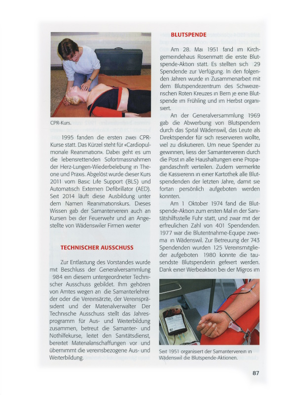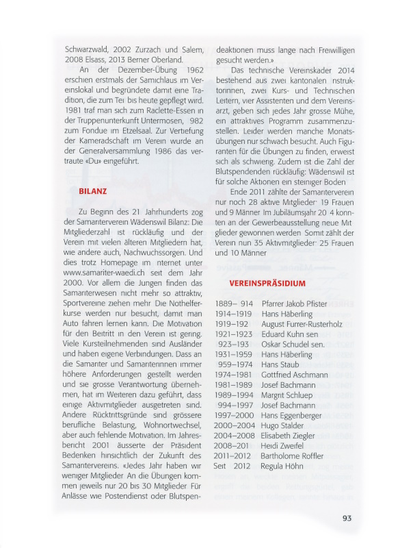 www.samariter-waedi.ch seit dem Jahr 2000. Vor allem die Jungen finden das Samariterwesen nicht mehr so attraktiv, Sportvereine ziehen mehr. Die Nothelferkurse werden nur besucht, damit man Auto fahren lernen kann. Die Motivation für den Beitritt in den Verein ist gering. Viele Kursteilnehmenden sind Ausländer und haben eigene Verbindungen. Dass an die Samariter und Samariterinnen immer höhere Anforderungen gestellt werden und sie grosse Verantwortung übernehmen, hat im Weiteren dazu geführt, dass einige Aktivmitglieder ausgetreten sind. Andere Rücktrittsgründe sind grössere berufliche Belastung, Wohnortwechsel, aber auch fehlende Motivation. Im Jahresbericht 2001 äusserte der Präsident Bedenken hinsichtlich der Zukunft des Samaritervereins: «Jedes Jahr haben wir weniger Mitglieder. An die Übungen kommen jeweils nur 20 bis 30 Mitglieder. Für Anlässe wie Postendienst oder Blutspendenaktionen muss lange nach Freiwilligen gesucht werden.»