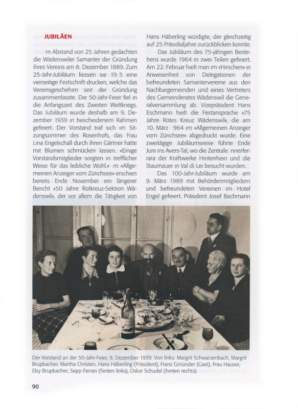Im Abstand von 25 Jahren gedachten die Wädenswiler Samariter der Gründung ihres Vereins am 8. Dezember 1889. Zum 25-Jahr-Jubiläum liessen sie 1915 eine vierseitige Festschrift drucken, welche das Vereinsgeschehen seit der Gründung zusammenfasste. Die 50-Jahr-Feier fiel in die Anfangszeit des Zweiten Weltkriegs. Das Jubiläum wurde deshalb am 9. Dezember 1939 in bescheidenem Rahmen gefeiert. Der Vorstand traf sich im Sitzungszimmer des Rosenhofs, das Frau Lina Engelschall durch ihren Gärtner hatte mit Blumen schmücken lassen. «Einige Vorstandsmitglieder sorgten in trefflicher Weise für das leibliche Wohl.» Im «Allgemeinen Anzeiger vom Zürichsee» erschien bereits Ende November ein längerer Bericht «50 Jahre Rotkreuz-Sektion Wädenswil», der vor allem die Tätigkeit von Hans Häberling würdigte, der gleichzeitig auf 25 Präsidialjahre zurückblicken konnte.