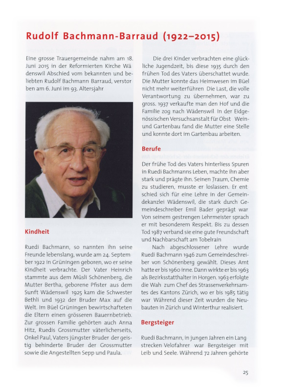 Eine grosse Trauergemeinde nahm am 18. Juni 2015 in der Reformierten Kirche Wädenswil Abschied vom bekannten und beliebten Rudolf Bachmann-Barraud, verstorben am 6. Juni im 93. Altersjahr.