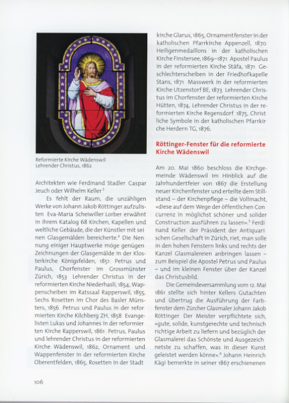 Im Jahre 2012 beendete Eva-Maria Scheiwiller-Lorber ihr Studium an der Universität Zürich mit einer Dissertation über Johann Jakob Röttinger, einen Glasmalerpionier im Dienste des Historismus.1 Sie konnte dabei den Nachlass der Glasmalerfamilie auswerten, der 2008 der Zentralbibliothek Zürich geschenkt worden war. Dieser umfasst 1100 Maquetten und Zeichnungen, zirka 200 Bleirisse, sieben Skizzenbücher, Vorlagenmaterial, rund 650 Fotoplatten, acht Fotoalben und rund hundert Fotografien.1