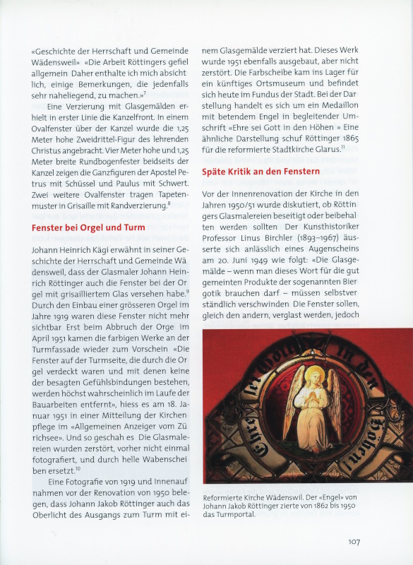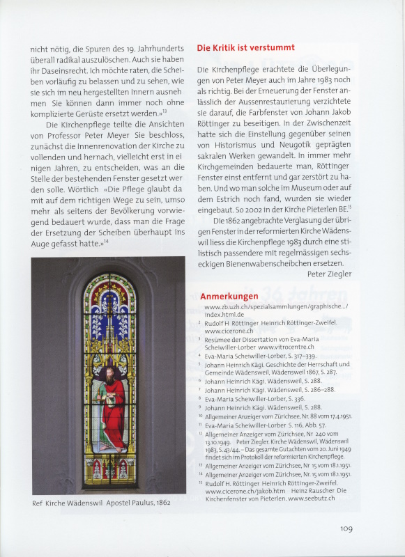Vor der Innenrenovation der Kirche in den Jahren 1950/51 wurde diskutiert, ob Röttingers Glasmalereien beseitigt oder beibehalten werden sollten. Der Kunsthistoriker Professor Linus Birchler (1893–1967) äusserte sich anlässlich eines Augenscheins am 20. Juni 1949 wie folgt: «Die Glasgemälde – wenn man dieses Wort für die gut gemeinten Produkte der sogenannten Biergotik brauchen darf – müssen selbstverständlich verschwinden. Die Fenster sollen, gleich den andern, verglast werden, jedoch erheblich dunkler, was das Auge gar nicht bemerken wird, da man direkt in diese Fenster hineinsieht.»12 Mit dieser Wertung konnten sich verschiedene Wädenswiler nicht anfreunden. Ein Gegengutachten gab ihnen Recht.