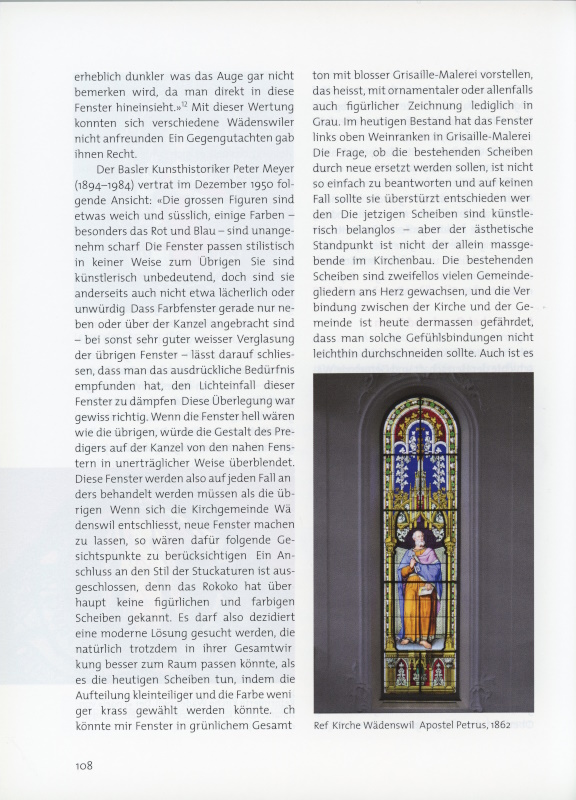 Der Basler Kunsthistoriker Peter Meyer (1894–1984) vertrat im Dezember 1950 folgende Ansicht: «Die grossen Figuren sind etwas weich und süsslich, einige Farben – besonders das Rot und Blau – sind unangenehm scharf. Die Fenster passen stilistisch in keiner Weise zum Übrigen. Sie sind künstlerisch unbedeutend, doch sind sie anderseits auch nicht etwa lächerlich oder unwürdig. Dass Farbfenster gerade nur neben oder über der Kanzel angebracht sind – bei sonst sehr guter weisser Verglasung der übrigen Fenster – lässt darauf schliessen, dass man das ausdrückliche Bedürfnis empfunden hat, den Lichteinfall dieser Fenster zu dämpfen. Diese Überlegung war gewiss richtig. Wenn die Fenster hell wären wie die übrigen, würde die Gestalt des Predigers auf der Kanzel von den nahen Fenstern in unerträglicher Weise überblendet. Diese Fenster werden also auf jeden Fall anders behandelt werden müssen als die übrigen. Wenn sich die Kirchgemeinde Wädenswil entschliesst, neue Fenster machen zu lassen, so wären dafür folgende Gesichtspunkte zu berücksichtigen: Ein Anschluss an den Stil der Stuckaturen ist ausgeschlossen, denn das Rokoko hat überhaupt keine figürlichen und farbigen Scheiben gekannt. Es darf also dezidiert eine moderne Lösung gesucht werden, die natürlich trotzdem in ihrer Gesamtwirkung besser zum Raum passen könnte, als es die heutigen Scheiben tun, indem die Aufteilung kleinteiliger und die Farbe weniger krass gewählt werden könnte. Ich könnte mir Fenster in grünlichem Gesamtton mit blosser Grisaille-Malerei vorstellen, das heisst, mit ornamentaler oder allenfalls auch figürlicher Zeichnung lediglich in Grau. Im heutigen Bestand hat das Fenster links oben Weinranken in Grisaille-Malerei. Die Frage, ob die bestehenden Scheiben durch neue ersetzt werden sollen, ist nicht so einfach zu beantworten und auf keinen Fall sollte sie überstürzt entschieden werden. Die jetzigen Scheiben sind künstlerisch belanglos – aber der ästhetische Standpunkt ist nicht der allein massgebende im Kirchenbau. Die bestehenden Scheiben sind zweifellos vielen Gemeindegliedern ans Herz gewachsen, und die Verbindung zwischen der Kirche und der Gemeinde ist heute dermassen gefährdet, dass man solche Gefühlsbindungen nicht leichthin durchschneiden sollte. Auch ist es nicht nötig, die Spuren des 19. Jahrhunderts überall radikal auszulöschen. Auch sie haben ihr Daseinsrecht. Ich möchte raten, die Scheiben vorläufig zu belassen und zu sehen, wie sie sich im neu hergestellten Innern ausnehmen. Sie können dann immer noch ohne komplizierte Gerüste ersetzt werden.»13