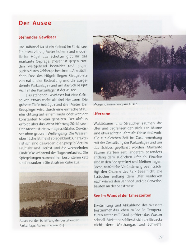 Die Halbinsel Au ist ein Kleinod im Zürichsee. Ein etwa vierzig Meter hoher, rund modellierter Hügel aus Schotter gibt ihr das markante Gepräge. Dieser ist gegen Norden weitgehend bewaldet und gegen Süden durch Rebberge bestimmt. Am südlichen Fuss des Hügels liegen Riedgebiete von nationaler Bedeutung und die ausgedehnte Parkanlage rund um das Schlossgut Au. Teil der Parkanlage ist der Ausee.