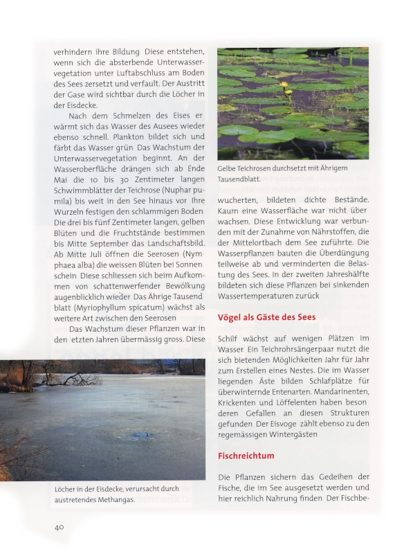 Erwärmung und Abkühlung des Wassers bestimmen das Leben im See. Bei Temperaturen unter null Grad gefriert das Wasser schnell. Meistens schliesst sich die Eisdecke nicht, denn Methangas und Schwefel verhindern ihre Bildung. Diese entstehen, wenn sich die absterbende Unterwasservegetation unter Luftabschluss am Boden des Sees zersetzt und verfault. Der Austritt der Gase wird sichtbar durch die Löcher in der Eisdecke.