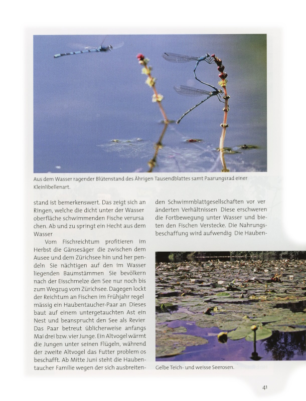 Das Paar betreut üblicherweise anfangs Mai drei bzw. vier Junge. Ein Altvogel wärmt die Jungen unter seinen Flügeln, während der zweite Altvogel das Futter problemlos beschafft. Ab Mitte Juni steht die Haubentaucher-Familie wegen der sich ausbreitenden Schwimmblattgesellschaften vor veränderten Verhältnissen. Diese erschweren die Fortbewegung unter Wasser und bieten den Fischen Verstecke. Die Nahrungsbeschaffung wird aufwendig. Die Haubentaucher können nicht zum Zürichsee wechseln, da die Jungen nicht flugfähig sind.