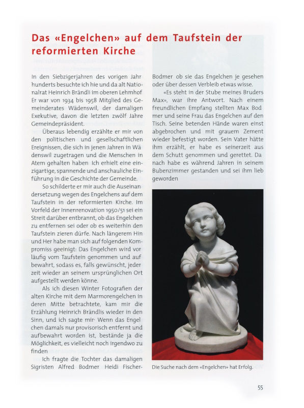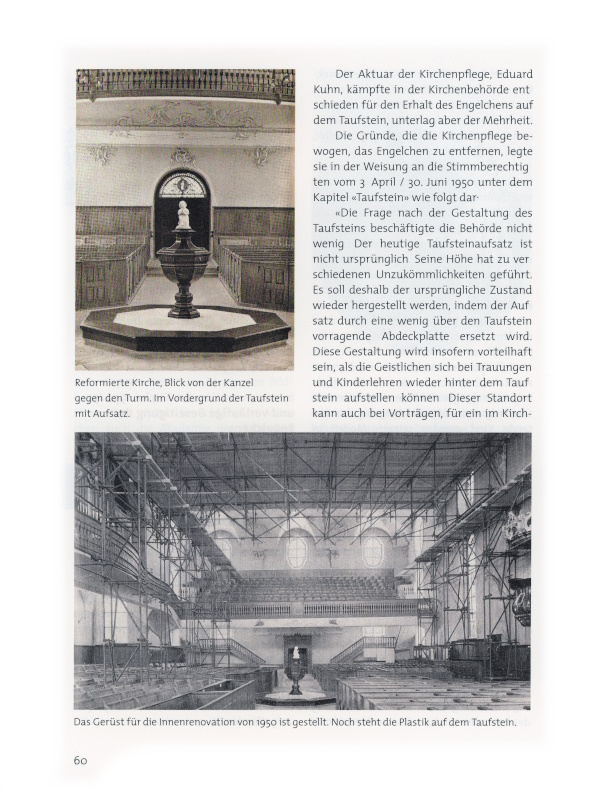 So schilderte er mir auch die Auseinandersetzung wegen des Engelchens auf dem Taufstein in der reformierten Kirche. Im Vorfeld der Innenrenovation 1950/51 sei ein Streit darüber entbrannt, ob das Engelchen zu entfernen sei oder ob es weiterhin den Taufstein zieren dürfe. Nach längerem Hin und Her habe man sich auf folgenden Kompromiss geeinigt: Das Engelchen wird vorläufig vom Taufstein genommen und aufbewahrt, sodass es, falls gewünscht, jederzeit wieder an seinem ursprünglichen Ort aufgestellt werden könne.