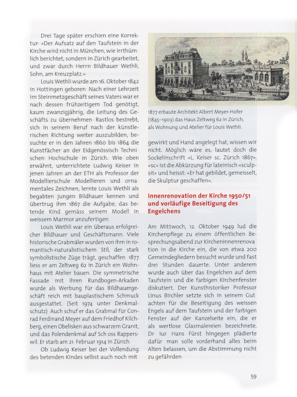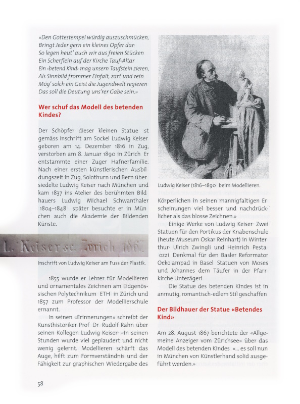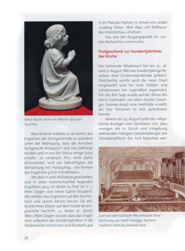 Prof. Dr. h. c. Peter Ziegler und seiner Gattin Elisabeth. Wir stellten das Engelchen auf den Küchentisch und sassen darum herum. Da entdeckte Peter Ziegler auf dem Sockel die eingravierte Inschrift: «L. Keiser sc. Zürich 1867». Peter Ziegler wusste, dass das Engelchen anlässlich der Hundertjahrfeier in die Wädenswiler Kirche kam und Elisabeth gab in ihr Smartphon den Namen «L. Keiser» ein, wobei «Ludwig Keiser, 1816–1890, ein Bildhauer des Historismus», erschien.